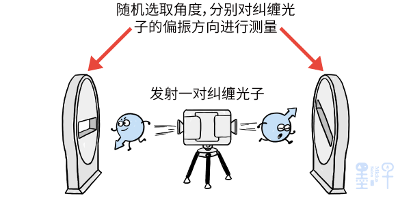 在贝尔的方法中,我们需要用一台机器向两个方向不断发射一对对处于量子纠缠态的光子,然后在机器的两边,通过两台测量仪器随机地从两个角度中二选一,分别对纠缠光子的偏振方向进行测量。