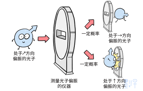 例如,如果一个光子处于↑方向偏振和→方向偏振的叠加状态中,那么当物理学家在放置一个沿着水平方向测量光子偏振的仪器时,仪器就会有一定概率测出→偏振的结果,以一定概率测出↑偏振的结果。每次实验得到什么结果,看起来都是随机的。
